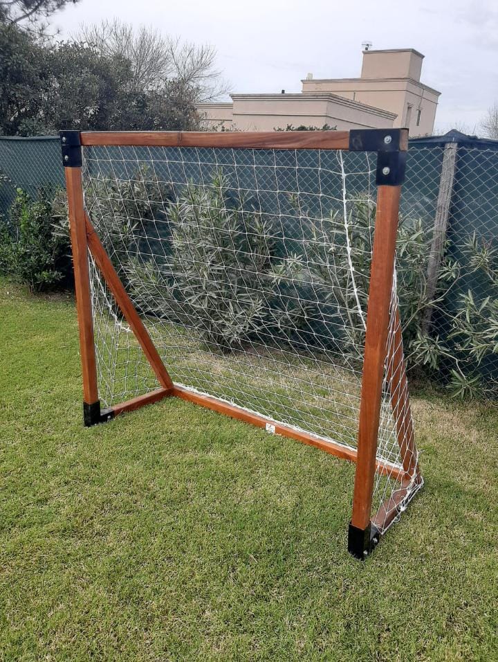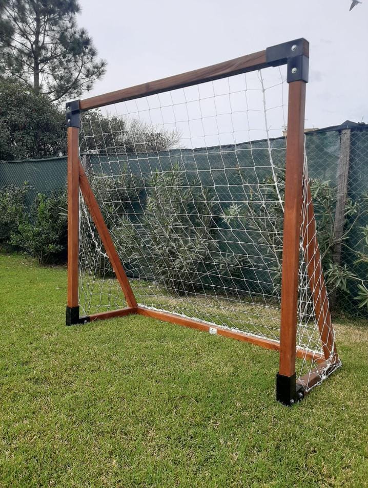 Arco de fútbol fabricado en madera dura o eucalyptus de 3×3″, con bordes biselados y caras cepilladas y lijadas. Pintado con 3 manos de Cetol Balance satinado color Caoba. Buloneria de 5/16″ galvanizada y 4 nudos de encastre frontales en hierro pintados a horno de color negro. Incluye red profesional de fútbol.